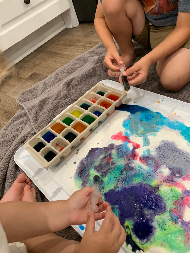 You can change this activity around just by changing the accessories. In the video at the top I have the vinegar in a condiment bottle and the food coloring in drops on the baking soda. In this picture I started out with baking soda on the tub lid and vinegar with the food coloring mixed in in an ice cube tray. I also added some syringes so that my kids could work on their fine motor skills. They had a blast with this one!