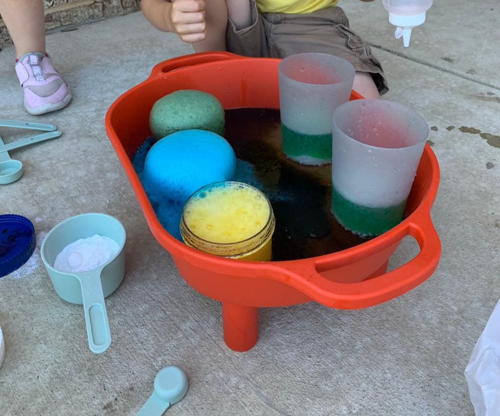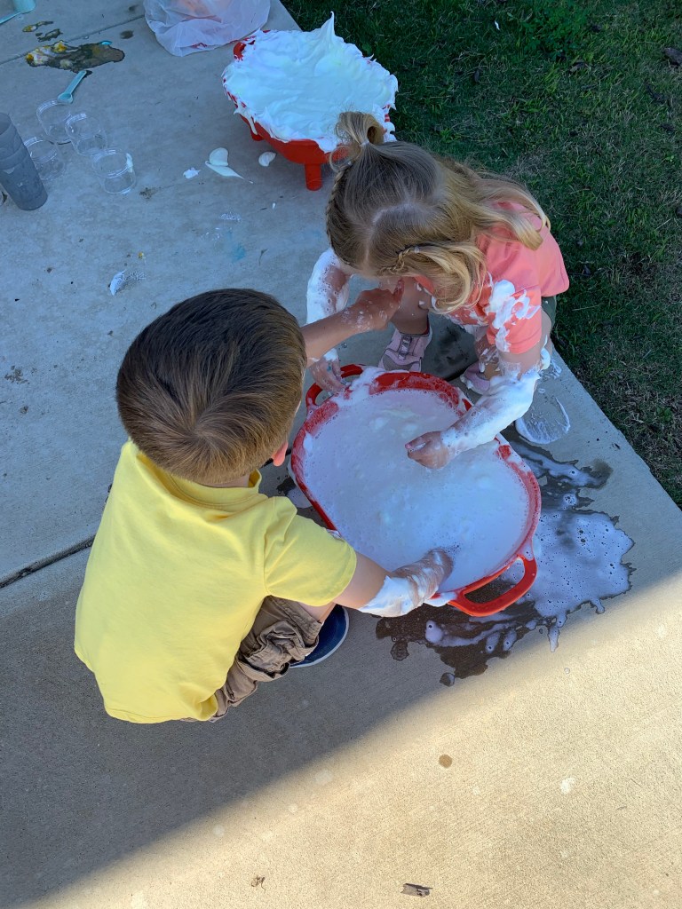 If you are feeling really brave you can add in more ingredients to the potion making. I have added in dish soap, shaving cream, & water before. You have to be prepared for a mess if you are going to attempt this. This was a pain to clean up, but my kids LOVED it!
